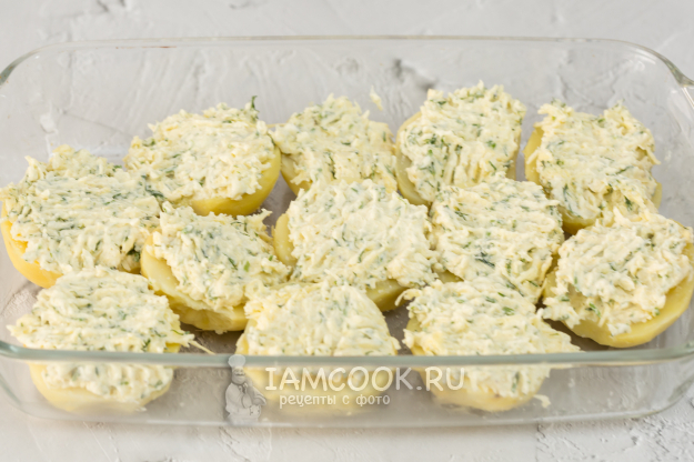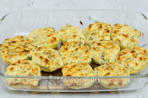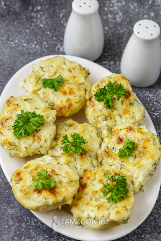 Запекайте картошку с сыром и чесноком в духовке, разогретой до 180 градусов, в течение 15-20 минут.