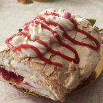 Меренговый рулет с клубникой готов. Украсьте верх рулета и подавайте к столу!