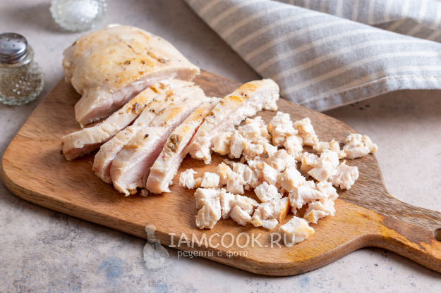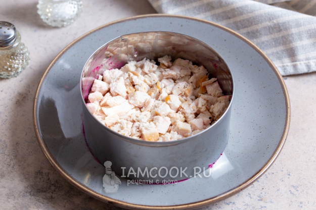 Далее выложите нарезанную курицу и слегка промажьте майонезом или сделайте майонезную сеточку.
