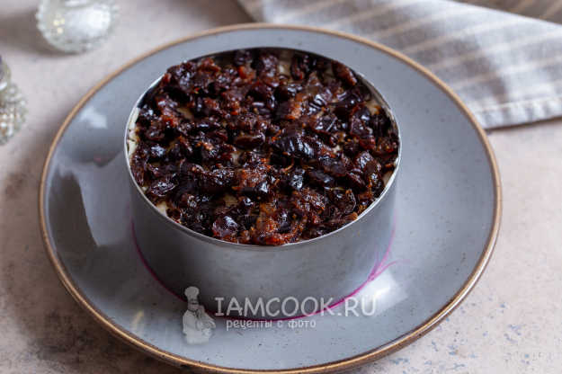 Слоеный салат «Чингисхан» с курицей, черносливом и орехами готов. Подавайте салат охлаждённым.