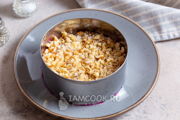 Обжаренные грецкие орехи порубите мелко ножом и выложите следующим слоем в салат.