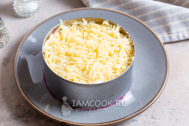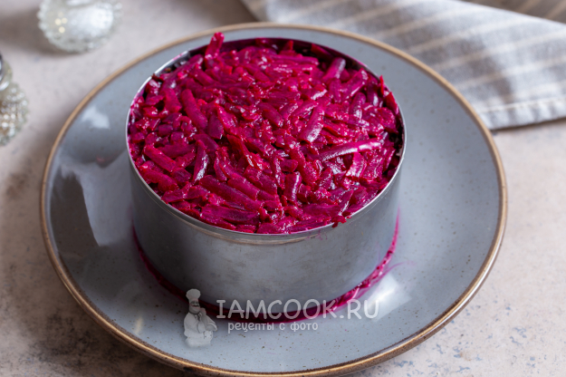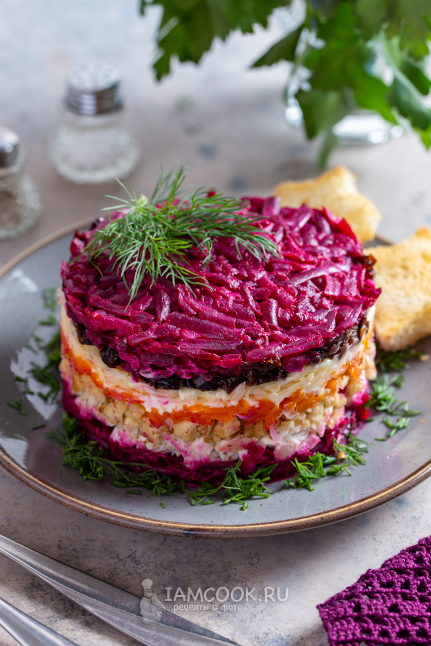 Последним слоем в салат выложите оставшуюся свеклу с майонезом и чесноком. Салату рекомендуется немного постоять в холодильнике перед подачей на стол.