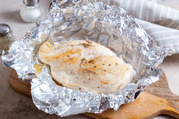 Я выбрала вариант обжарить куриную грудку целиком на сковороде. Для этого её следует натереть солью и чёрным молотым перцем и на сковороде с маслом обжарить на сильном огне минут 5-7. Затем завернуть в фольгу, для равномерного распределения соков.