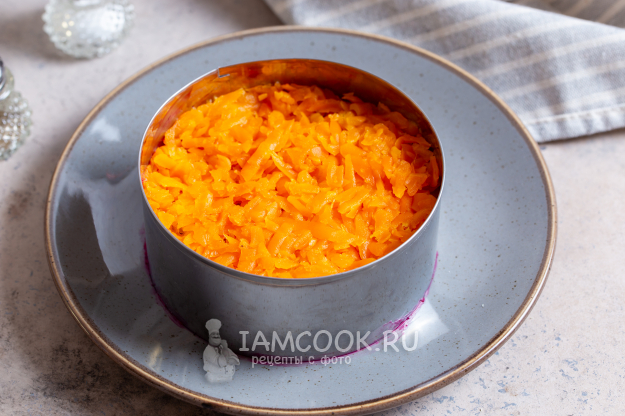 Морковь очистите от шкурки и натрите на крупной тёрке. Выложите следующим слоем в салат и промажьте слегка майонезом.
