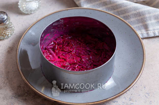 Первым слоем в салат выложите половину подготовленной массы со свеклой.