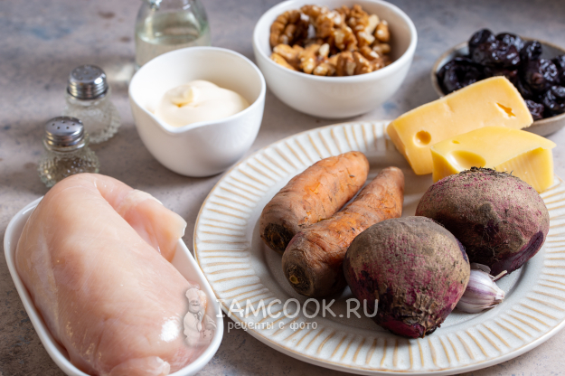 Подготовьте указанные ингредиенты для слоеного салата «Чингисхан» с курицей, черносливом и орехами. Овощи следует предварительно отварить и охладить. Грецкие орехи берите уже обжаренные. Сыр - твёрдый.