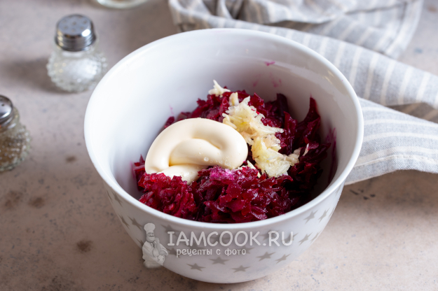 Свеклу очистите от шкурки и натрите на крупной тёрке. Добавьте измельчённый чеснок, столовую ложку майонеза и немного соли, перемешайте.