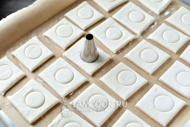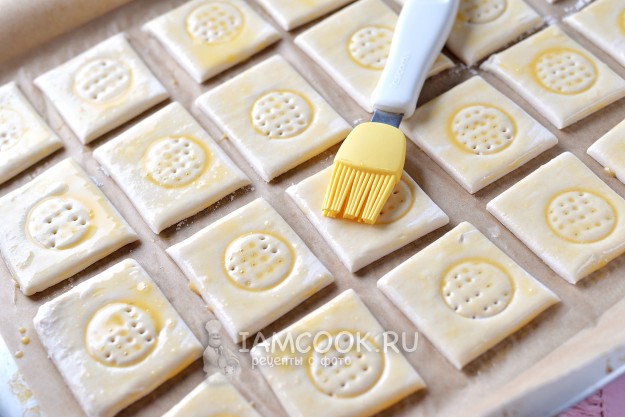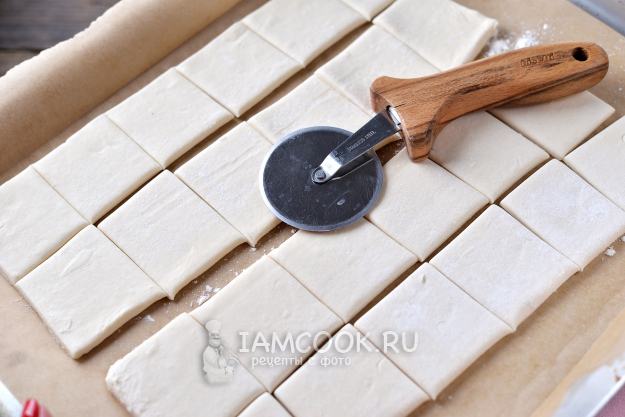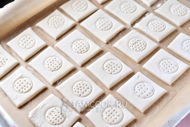 Выстелите противень пекарской бумагой, чуть присыпьте ее мукой. Нарежьте слоеное тесто на небольшие квадратики не больше 3х3 сантиметра.