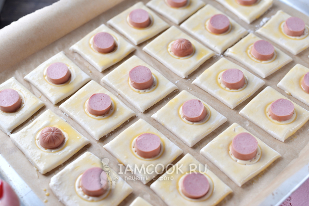 Положите кусочки сосисок в центр заготовок, вдавите их в тесто. Отправьте противень в предварительно разогретую до 190 градусов духовку на 15-20 минут в режиме верхнего и нижнего нагрева. Как только яйцо зарумянится - слойки готовы.