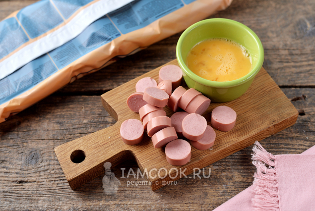 Взбейте яйцо в небольшой пиалочке, нарежьте сосиски кружочками толщиной около 1 сантиметра.