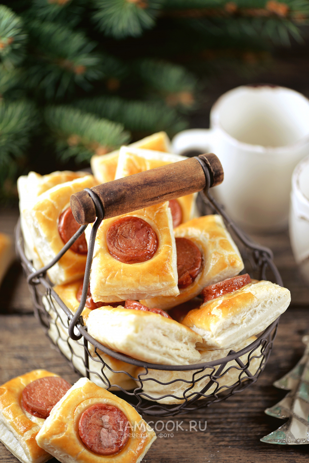 Мини-слойки «Кнопочки» с сосиской готовы! Подавать их можно с любимым соусом, с любимым напитком, в теплом или в холодном виде.
