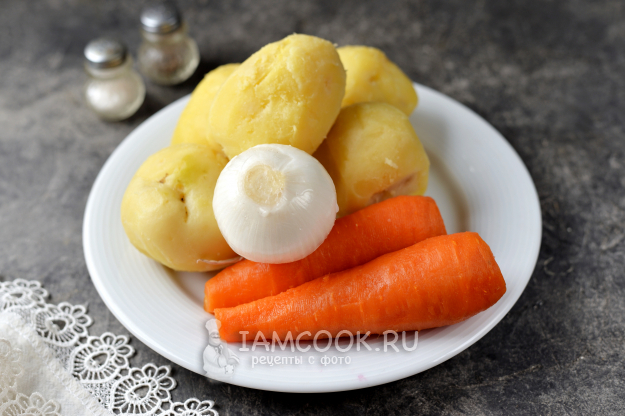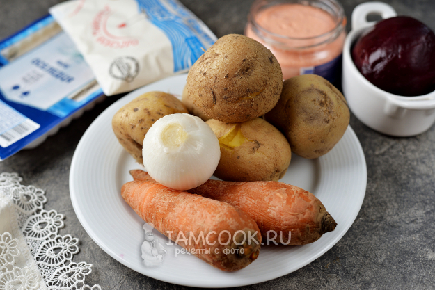Подготовьте все ингредиенты по списку, овощи заранее отварите и остудите. Помните, что свекле нужно минимум минут 40-60, в зависимости от размера корнеплода, картофелю - около 20, а моркови нужно не менее 15 минут для готовности.