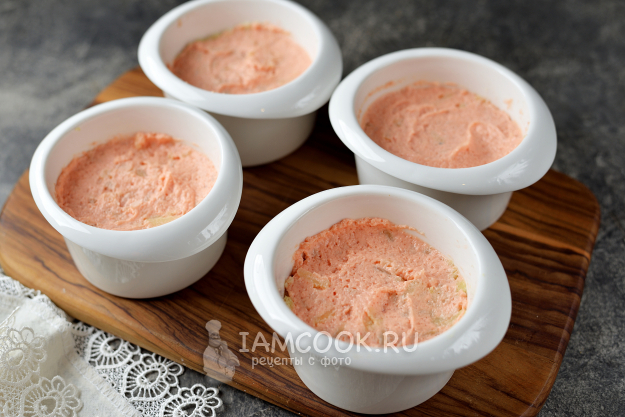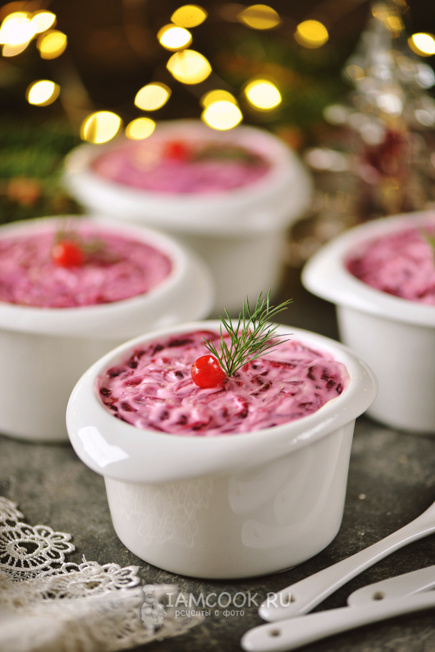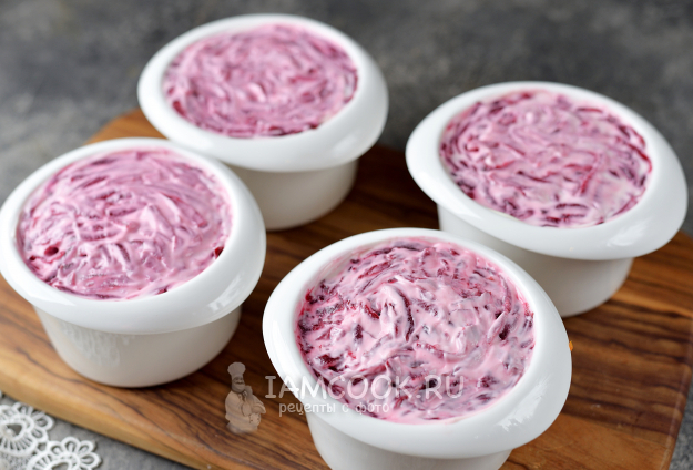И последний слой - из вареной свеклы с небольшой прослойкой качественного майонеза любимого производителя. Накройте формы пищевой пленкой и отправьте в холодильник до подачи пропитываться.