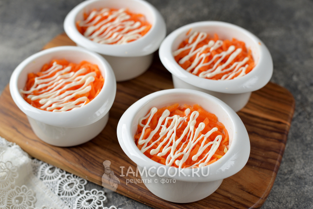 Дальше идет слой натертой моркови, который также полейте или смажьте майонезом.
