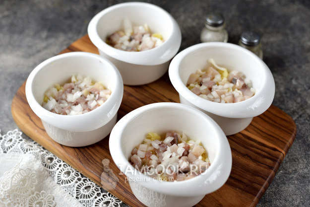 Дальше положите нарезанные мелким кубиком селедку и репчатый лук.