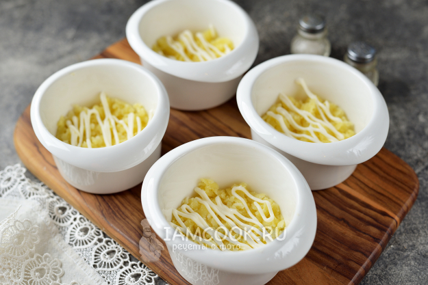 Первым слоем выложите натертый картофель, полейте его тоненько майонезом.