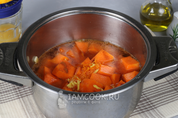 Залить содержимое кастрюли горячей водой и варить до мягкости тыквы.