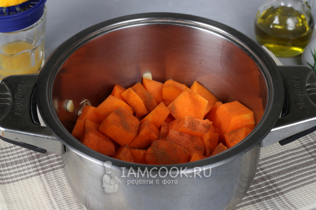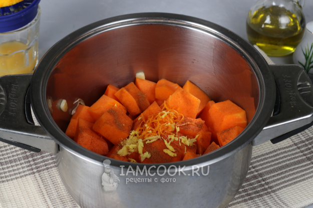 В кастрюлю налить масло, разогреть и добавить лук с чесноком. Немного обжарить овощи, до появления чесночного аромата, затем добавить в кастрюлю тыкву.