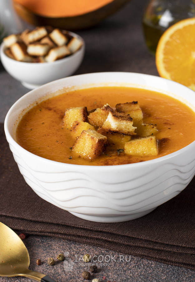 Тыквенный суп-пюре с апельсином готов. Можно подать к нему сухарики или тыквенные семечки.