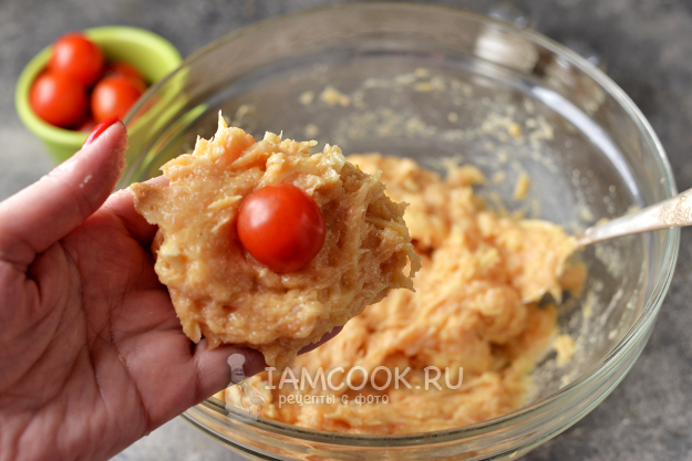 Мокрыми руками набирайте небольшое количество фарша, в середину положите мелкий помидор черри, сформируйте котлету желаемой формы.