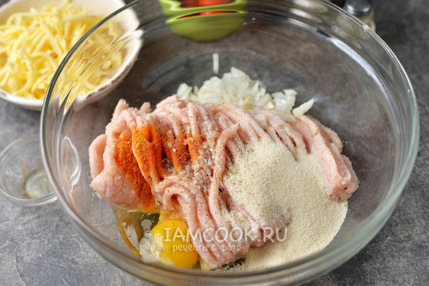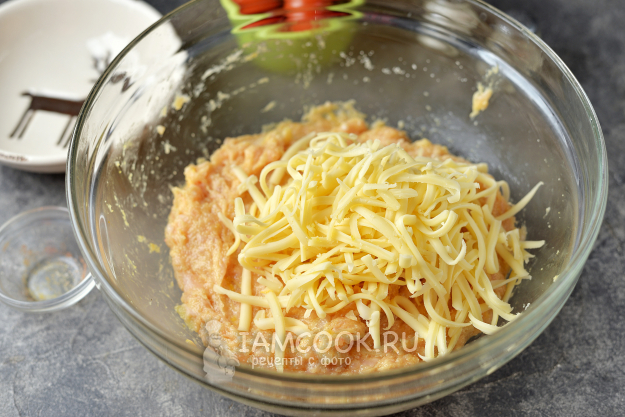 Спустя время переложите к фаршу натертый твердый сыр хорошего качества, еще раз перемешайте до однородности.