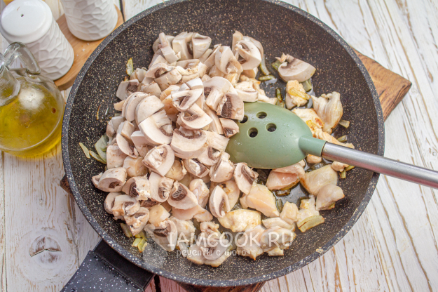 Для начинки в сковороде нагрейте масло, выложите мелко нарезанный лук, обжаривайте пару минут, добавьте нарезанное на небольшие кусочки куриное филе и жарьте еще 3-4 минуты. Затем добавьте нарезанные грибы.