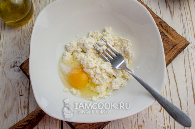 Начните с приготовления теста. В миску выложите творог, добавьте яйцо и соль, разомните вилкой.