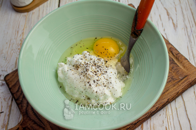 Для заливки в миске смешайте йогурт, яйцо, соль и черный молотый перец.