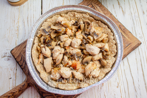 На слегка подпеченную основу пирога выложите начинку из грибов и курицы.