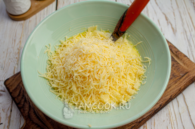 Добавьте натертый маложирный сыр и перемешайте заливку.