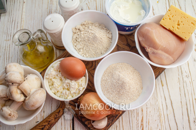 Подготовьте все необходимые ингредиенты для ПП киша с курицей и грибами.