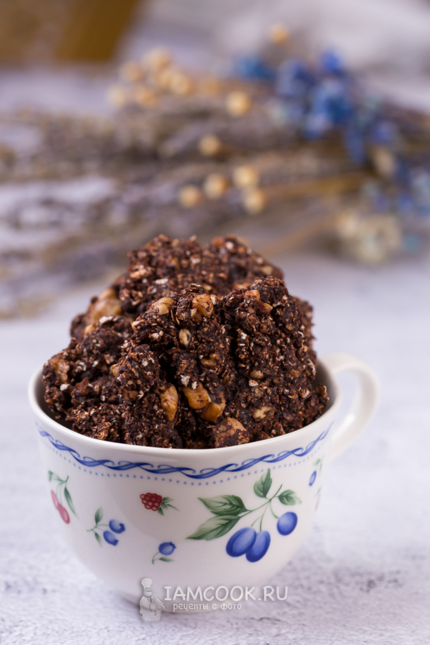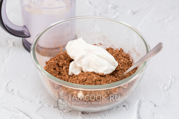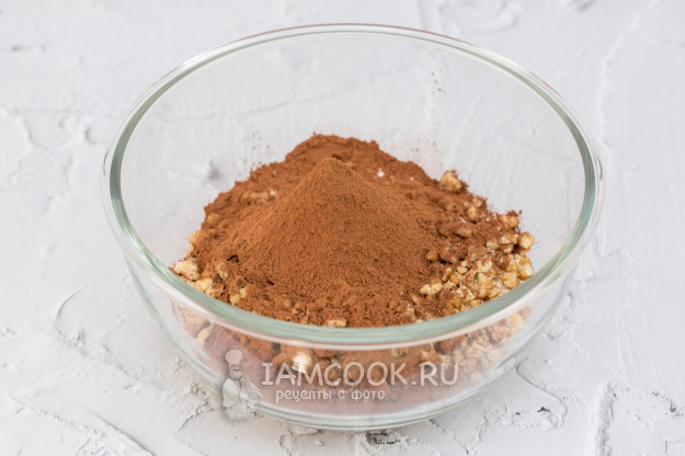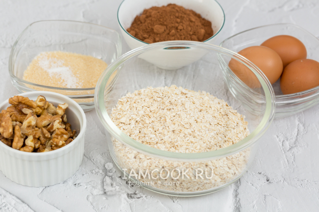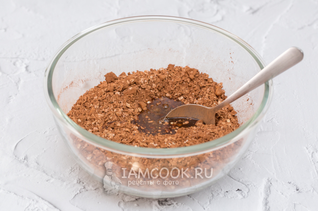 Смешайте овсяные хлопья, нарубленные орехи, какао, сахар.