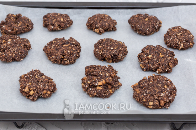 Выпекайте шоколадное овсяное печенье с какао в разогретой до 130 градусов духовке 25-30 минут.