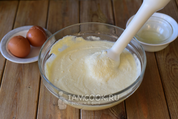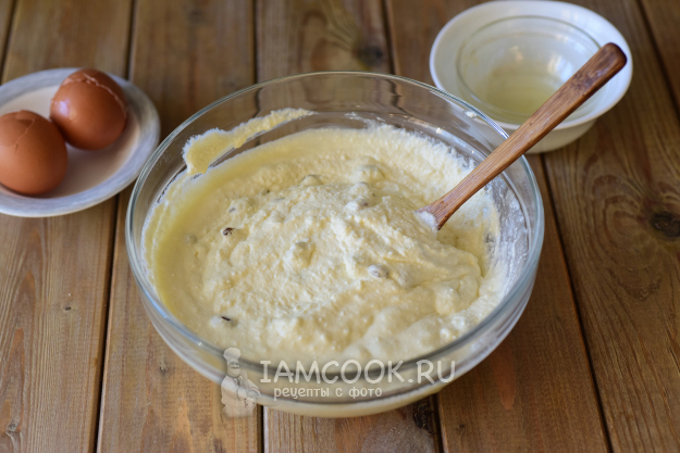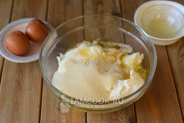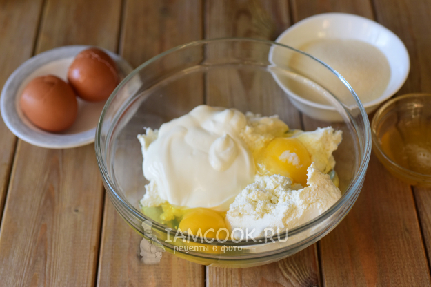 В миску выложим творог, добавим сметану, соль, вобьем яйца.