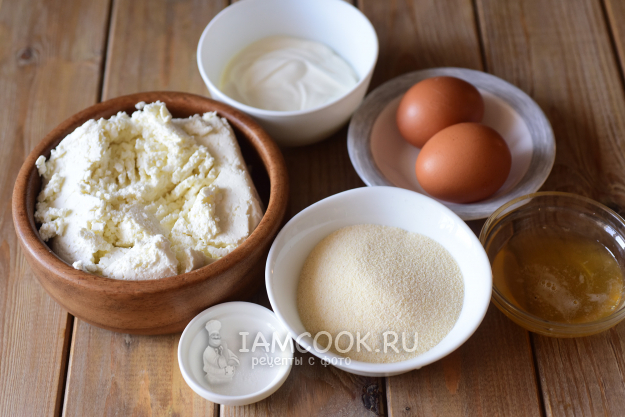 Возьмём необходимые ингредиенты для приготовления творожной запеканки с манкой ПП в духовке.