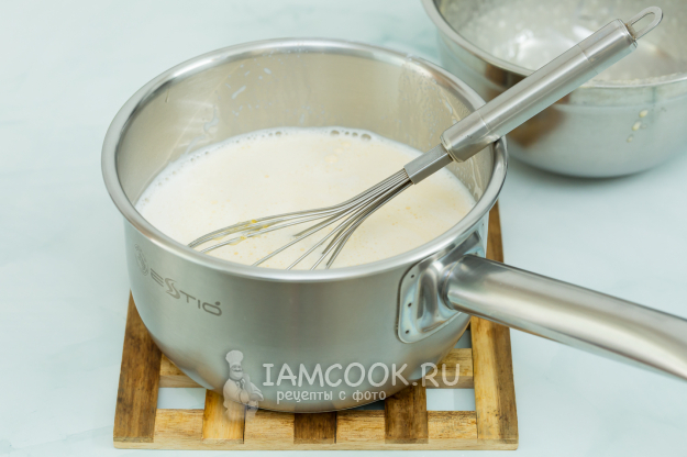 Затем полученную яично-молочную смесь верните в ковш с молоком.