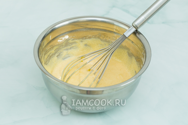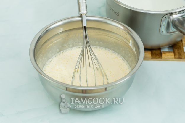 Немного горячего молока тонкой струйкой добавьте в миску с желтковой смесью, интенсивно помешивая.
