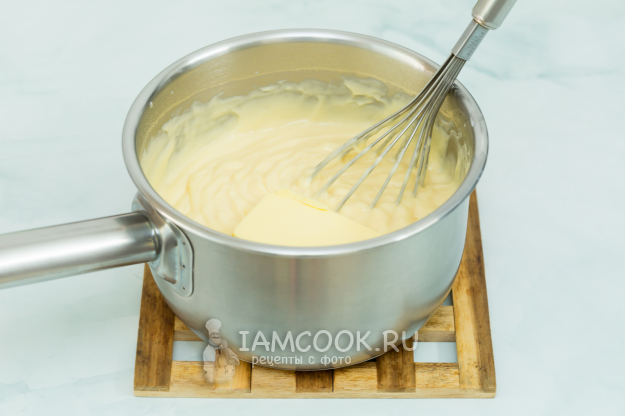 Так будет выглядеть крем: он гладкий, без комочков. Сразу добавьте сливочное масло и перемешайте до однородности.