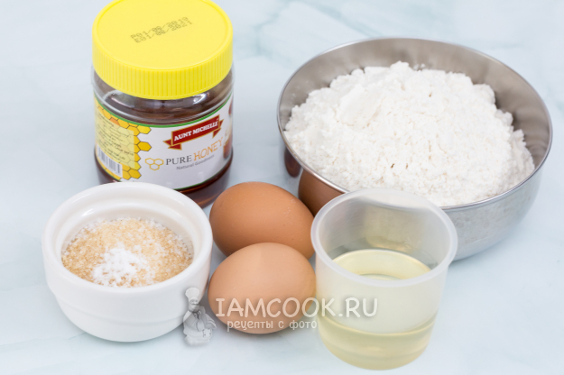 Для приготовления медового печенья на растительном масле подготовьте продукты по списку.