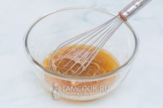 Смешайте яйца с сахаром, мёдом и солью. Слегка взбейте.