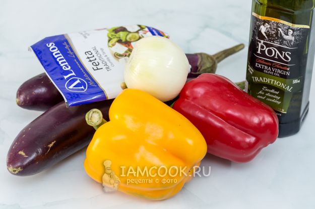 Для приготовления тёплого салата с баклажанами и сыром фета подготовьте продукты по списку.