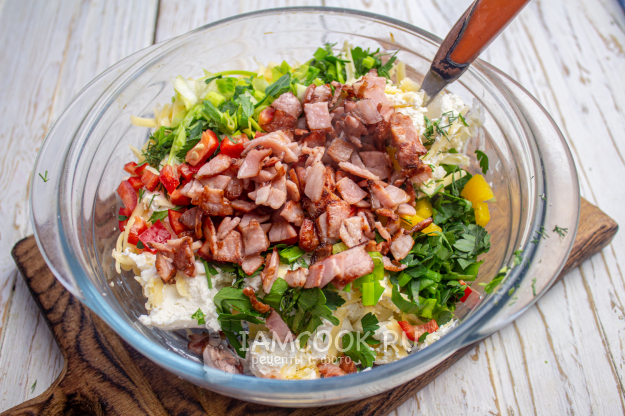 С обжаренного бекона слейте лишний жир - нам он не понадобится. Кусочки бекона отправьте в миску к остальным ингредиентам. Перемешайте хорошо массу, посолите и поперчите по вкусу.