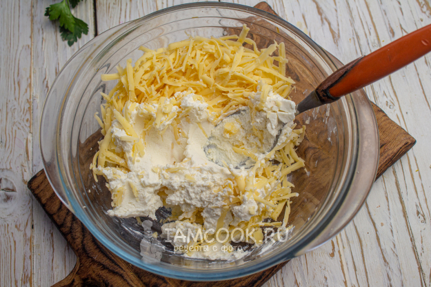 В миску выложите сыр "Рикотта", добавьте натертый твердый сыр.