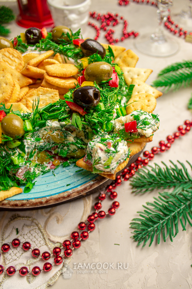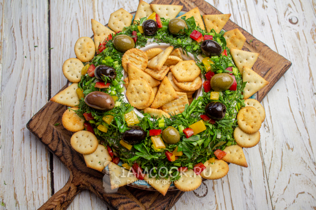 Украсьте подготовленный "венок" зеленью, нарезанными кубиками сладкого перца и оливками. Вокруг и в середину, в чашку, выложите крекер.
