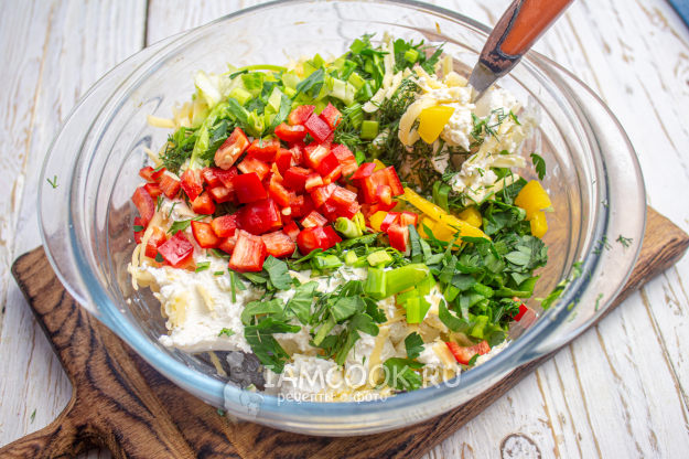 Сладкий перец разных цветов нарежьте мелкими кубиками и отправьте в миску с сыром. Чеснок пропустите через пресс и тоже добавьте к остальным ингредиентам.