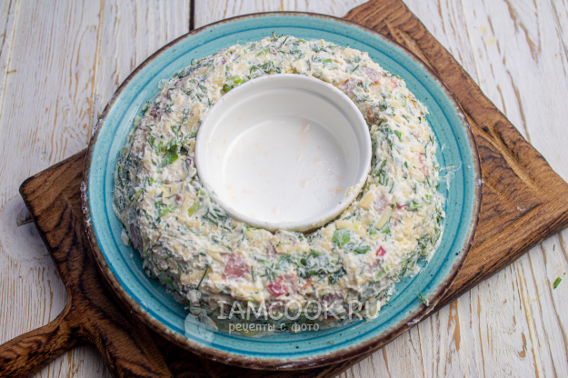 На плоское блюдо в середину установите небольшую чашечку, вокруг нее сформируйте из сырной массы венок. Хорошо утрамбуйте.