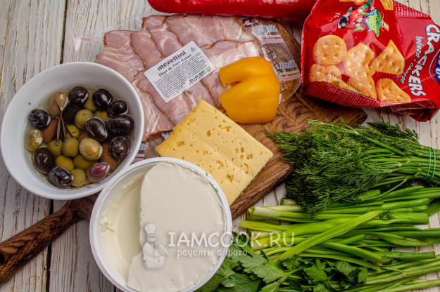 Подготовьте все необходимые ингредиенты для закуски «Рождественский венок» из сыра, оливок и бекона.