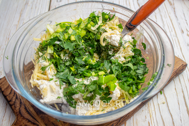 Зелень мелко измельчите и добавьте к сыру.