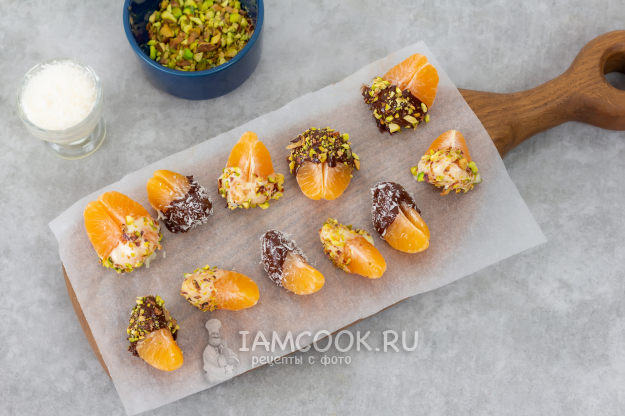 Присыпьте поверхность шоколадной глазури измельченными орехами, кокосовой стружкой или другим украшением по вашему выбору. Выложите кусочки мандаринов на лист пергаментной бумаги. Повторите процесс с оставшимися ингредиентами.
