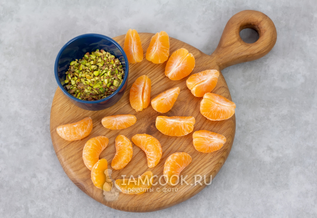 Очистите орехи и произвольно нарубите ножом. Пусть будут кусочки и покрупнее, и помельче. Так на вид получится даже интересней. Мандарины аккуратно очистите от кожуры и белых соединительных волокон. Крупные мандарины разберите на отдельные дольки, а мелкие можно оставить в виде ломтиков из двух соединенных долек.